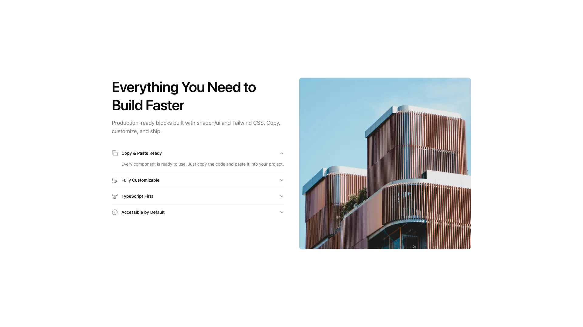 Browse 30+ production-ready blocks built with Shadcn UI. Copy the code, start building your project, and ship in hours instead of weeks.